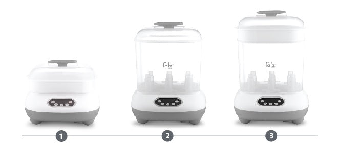- Thiết kế 3 cách lắp đặt thông minh điều chỉnh theo ba kích cỡ khác nhau, đáp ứng nhu cầu khử trùng của bạn. Cài đặt nhỏ nhất (1) có thể được sử dụng để khử trùng các vật dụng nhỏ như gặm nướu, ti ngậm, bộ cỡ trung bình (2) thích hợp với : máy hút sữa, bát, thìa dao và dĩa, trong khi cấu hình lớn nhất (3) có thể được sử dụng để khử trùng tối đa 9 chai cùng một lúc.